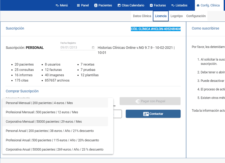 - Seleccione la suscripción deseada por periodo de pago y número de pacientes.